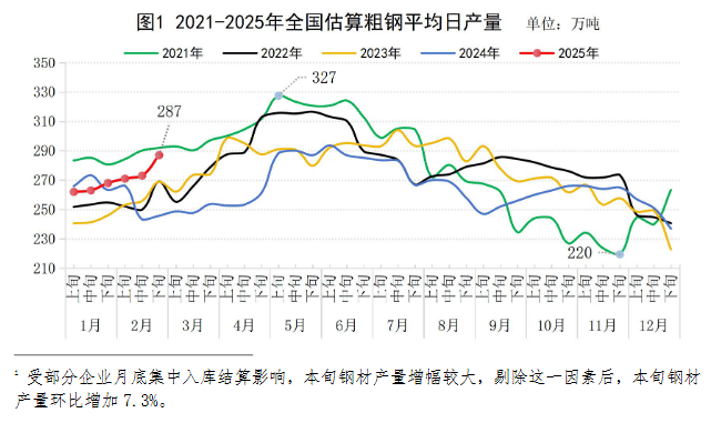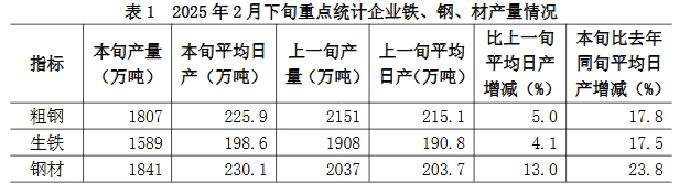 2025年2月下旬,重點(diǎn)統(tǒng)計鋼鐵企業(yè)共生產(chǎn)粗鋼1807萬噸,平均日產(chǎn)225.9萬噸,日產(chǎn)環(huán)比增長5.0%;生鐵1589萬噸,平均日產(chǎn)198.6萬噸,日產(chǎn)環(huán)比增長4.1%;鋼材1841萬噸,平均日產(chǎn)230.1萬噸,日產(chǎn)環(huán)比增長13.0%(見表1)1。