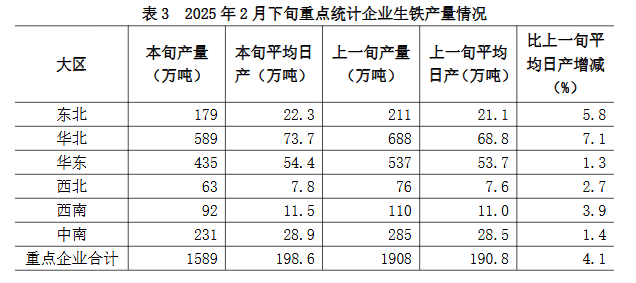 2月下旬六大地區(qū)重點(diǎn)統(tǒng)計企業(yè)生鐵日產(chǎn)量較上一旬均有不同程度增長(詳見表3),具體為: