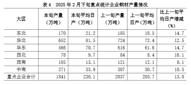 2月下旬六大地區(qū)重點(diǎn)統(tǒng)計企業(yè)鋼材日產(chǎn)量較上一旬均有不同程度增長(詳見表4),具體為: